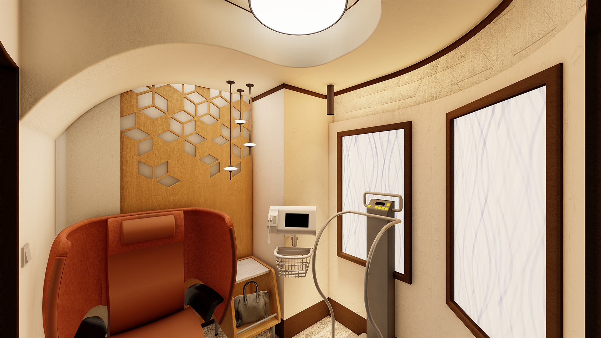 Privacy in the vitals station can be created through the use of forms and colors. The form of the ceiling and walls separates the space from the public areas, while colors can ease stress and create a comforting environment. This can help build patient trust in Mayo, carried throughout their visit. Organic shapes and muted, sophisticated colors provide a comfortable and professional environment.
